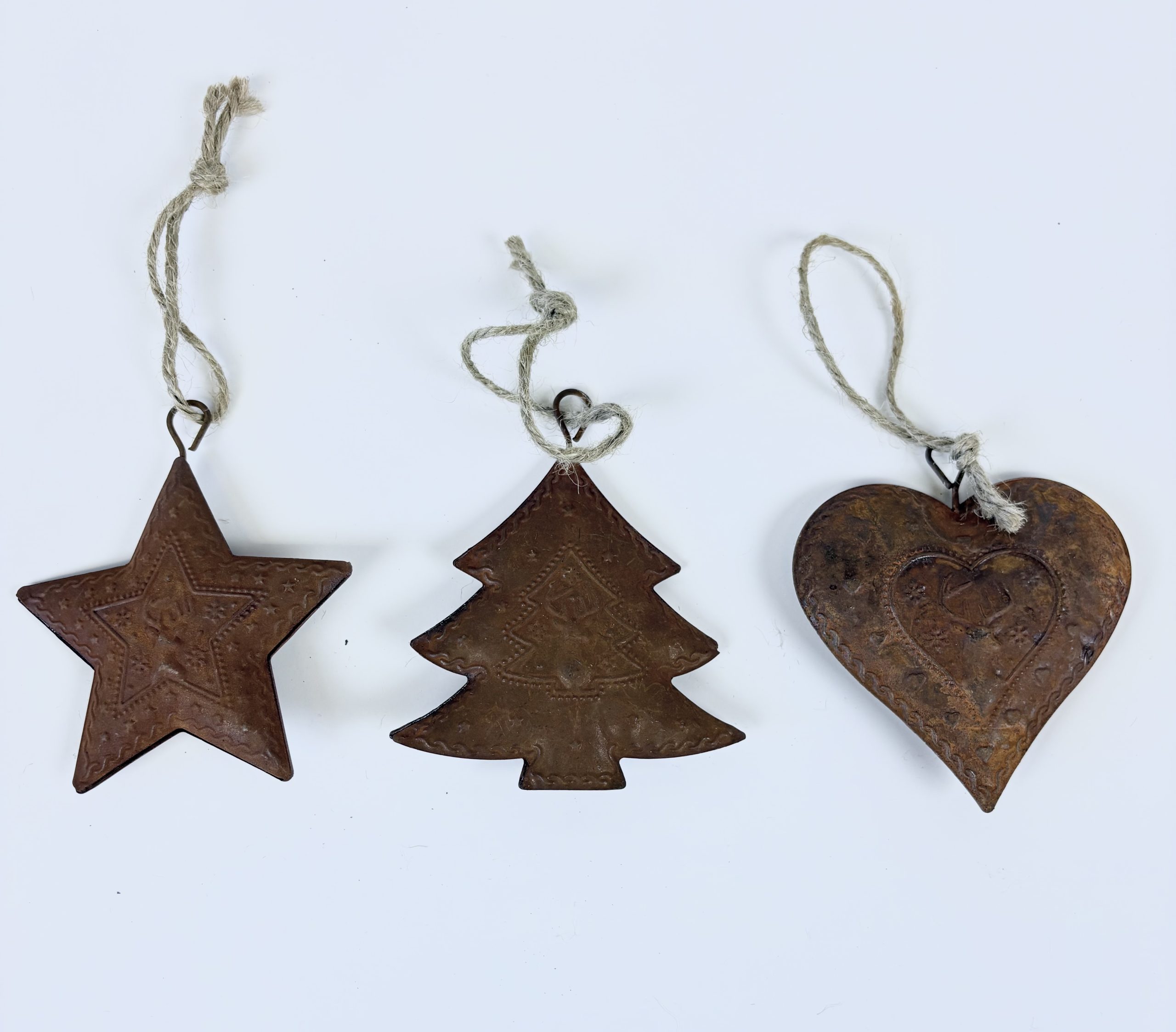 Rostiga med dekor, snöre till upphängning.