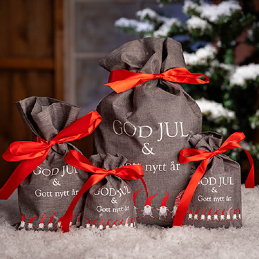Godissäck grå med dansande tomtar, röd rosett.
